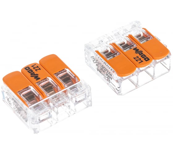 Клеммы WAGO 221-613 имеет трехпроводной разъем, подходит для присоединения проводников любых типов сечением от 0,5 до 6 мм2. Изделие способствует безопасной установке длинных кабельных трасс с большими поперечными сечениями проводов.