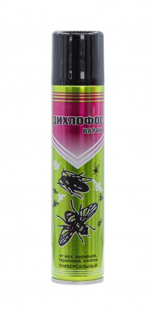 Средство предназначено для уничтожения летающих (мух, комаров, москитов) и нелетающих (тараканов, клопов, муравьев) насекомых в помещениях. Состав: тетраметрин 0,12%, циперметрин 0,20%, пиперонилбутоксид 0,40%, растворители > 30 %, бутан/пропан/изобутан смесь 15-30 %, функциональные добавки < 5%, отдушка < 5%.